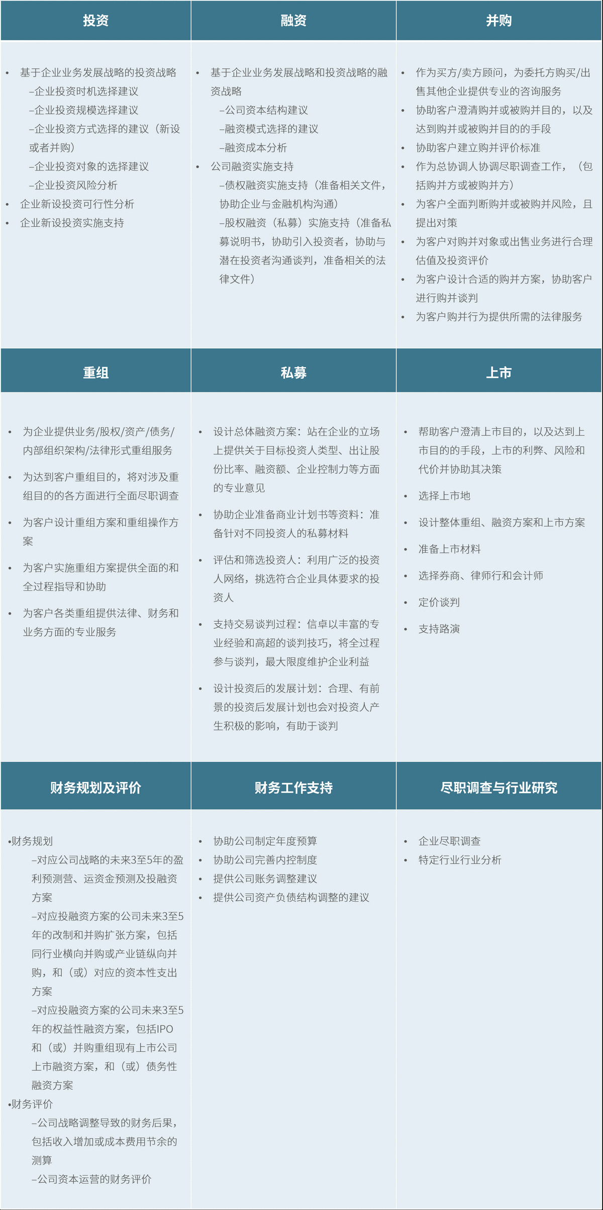 為并購(gòu)與被并購(gòu)企業(yè)提供投資、融資、并購(gòu)、重組、盡職調(diào)查、行業(yè)研究等工作