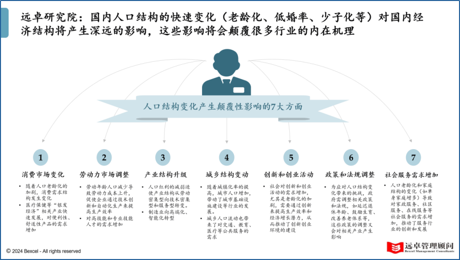 遠(yuǎn)卓洞察:遠(yuǎn)卓研究院觀察到,國(guó)內(nèi)人口結(jié)構(gòu)正在急劇變化?!袄淆g化”“低婚率”“少子化”的趨勢(shì)將顛覆性影響到消費(fèi)市場(chǎng)、勞動(dòng)力市場(chǎng)、產(chǎn)業(yè)結(jié)構(gòu)、城鄉(xiāng)結(jié)構(gòu)、創(chuàng)新創(chuàng)業(yè)、政策法規(guī)、社會(huì)服務(wù)等7大方面,這將對(duì)“十五五”期間的很多產(chǎn)業(yè)和行業(yè)的商業(yè)模式產(chǎn)生革命性的影響。