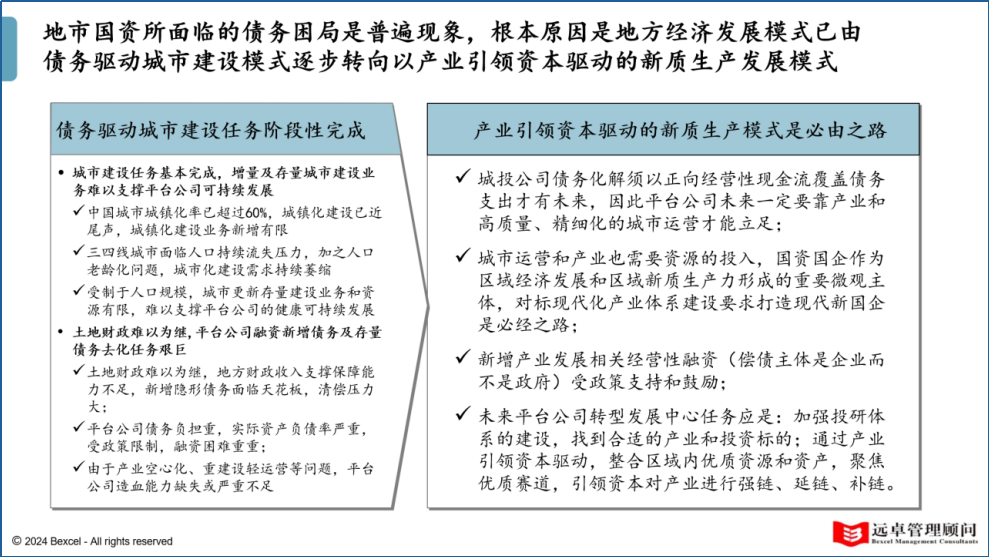 遠(yuǎn)卓洞察:在“十四五”時(shí)期,地市國(guó)資主要是以政府平臺(tái)公司為主導(dǎo),他們?cè)诨A(chǔ)設(shè)施建設(shè)、城市發(fā)展和公共服務(wù)等領(lǐng)域發(fā)揮了重要作用。然而,隨著經(jīng)濟(jì)形勢(shì)的變化和城市發(fā)展的新需求,這些平臺(tái)公司面臨產(chǎn)業(yè)化轉(zhuǎn)型升級(jí)的迫切需要?!笆逦濉逼陂g,地市政府平臺(tái)公司將加快產(chǎn)業(yè)化轉(zhuǎn)型升級(jí),以實(shí)現(xiàn)高質(zhì)量發(fā)展和可持續(xù)增長(zhǎng)。以下是這一轉(zhuǎn)型升級(jí)的關(guān)鍵路徑: