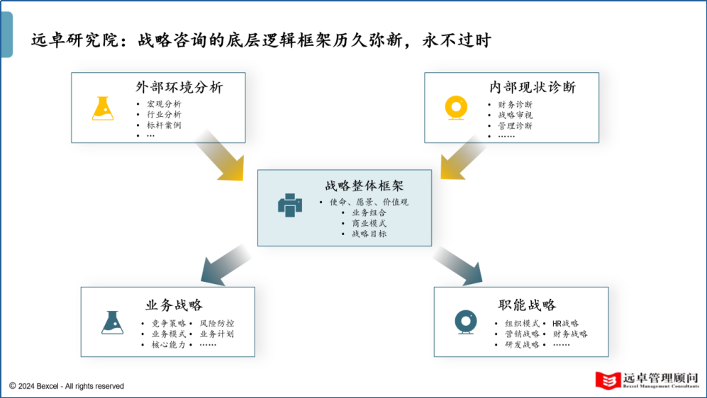 “遠(yuǎn)卓AI方法論”并非拋棄遠(yuǎn)卓使用二十多年的戰(zhàn)略咨詢的底層邏輯框架。無數(shù)過往實(shí)踐證明:戰(zhàn)略咨詢的底層邏輯框架在巨變的時(shí)代還是依然有效,即:基于外部環(huán)境分析和內(nèi)部狀況診斷的結(jié)果,構(gòu)建戰(zhàn)略整體框架,然后推演出業(yè)務(wù)戰(zhàn)略和職能戰(zhàn)略的經(jīng)典戰(zhàn)略邏輯觀,從而形成“五大戰(zhàn)略分析體系”,遠(yuǎn)卓認(rèn)為:當(dāng)前及未來都不會(huì)過時(shí)!