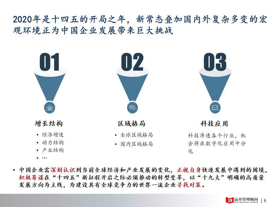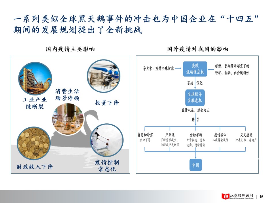 然而2020年初開始的“新冠肺炎”并引發(fā)的一系列的全球經(jīng)濟領(lǐng)域的百年不遇的“多米諾”骨牌效應(yīng)的發(fā)生,給即將到來的“十四五”規(guī)劃帶來了巨大的、顛覆性的沖擊。近期,遠卓研究院關(guān)注到兩個重大主流聲音的基調(diào):1、2020.4.8,中共中央政治局常務(wù)委員會召開會議,首次提出:【習近平總書記強調(diào):做好較長時間應(yīng)對外部環(huán)境變化的準備】。遠卓認為:這個較長時間很可能跟我們的十四五規(guī)劃有時間上的吻合度。2、2020年4月20日,全球歷史上從未出現(xiàn)過的的5月原油期貨-37美元收盤的“穿倉”,第二天遠卓老客戶中石油、中石化兩大央企迅速召開集團高層會議研討。中石油首次提出:【低油價使集團大而不強矛盾凸顯】;中石化提出 :【做好較長時間應(yīng)對外部環(huán)境變化的思想準備和工作準備】。遠卓認為:大央企首次承認自身“大而不強”、以及中央跟央企都提到“較長時間”,這說明“十四五規(guī)劃”的核心思想已經(jīng)發(fā)生了根本性的外部影響因素變化和內(nèi)部核心意識的轉(zhuǎn)變,這需要引起高度重視。